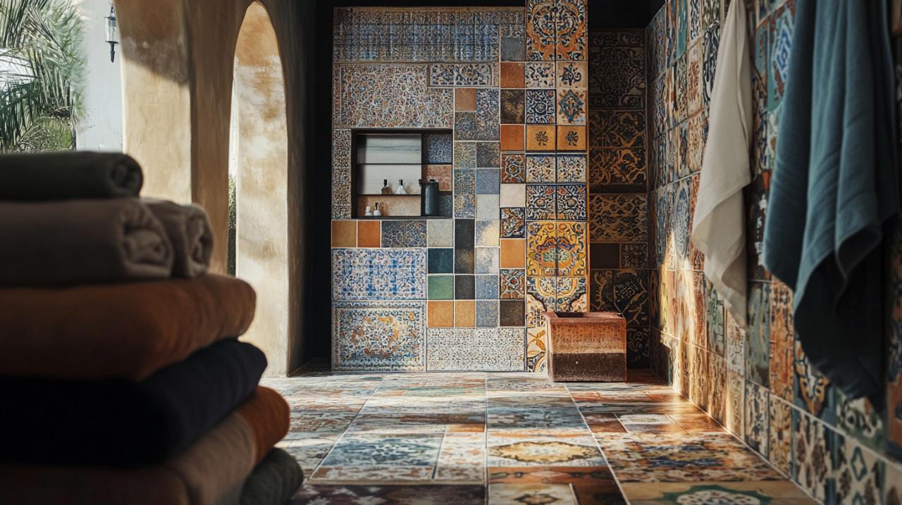 Chaque espace de votre maison présente des caractéristiques uniques qui influencent le choix du zellige. Dans la salle de bain, ce revêtement traditionnel apporte une touche de luxe et de sérénité, transformant cette pièce fonctionnelle en un véritable havre de paix. Les murs et sols peuvent accueillir ce matériau qui résiste parfaitement à l’humidité. Pour la cuisine, notamment en crédence, le zellige devient un élément décoratif majeur qui protège les murs tout en créant un point focal captivant. L’aspect artisanal se marie particulièrement bien avec une cuisine contemporaine ou traditionnelle. Le salon bénéficie également de cette mosaïque qui peut habiller un pan de mur ou créer une zone de transition entre différents espaces. L’utilisation du zellige en extérieur, sur une terrasse ou un mur extérieur, nécessite une attention particulière quant à la résistance aux intempéries, mais offre un résultat spectaculaire qui prolonge l’esthétique intérieure vers l’extérieur. Même pour une piscine, ce type de carrelage peut être envisagé pour créer une ambiance méditerranéenne authentique.